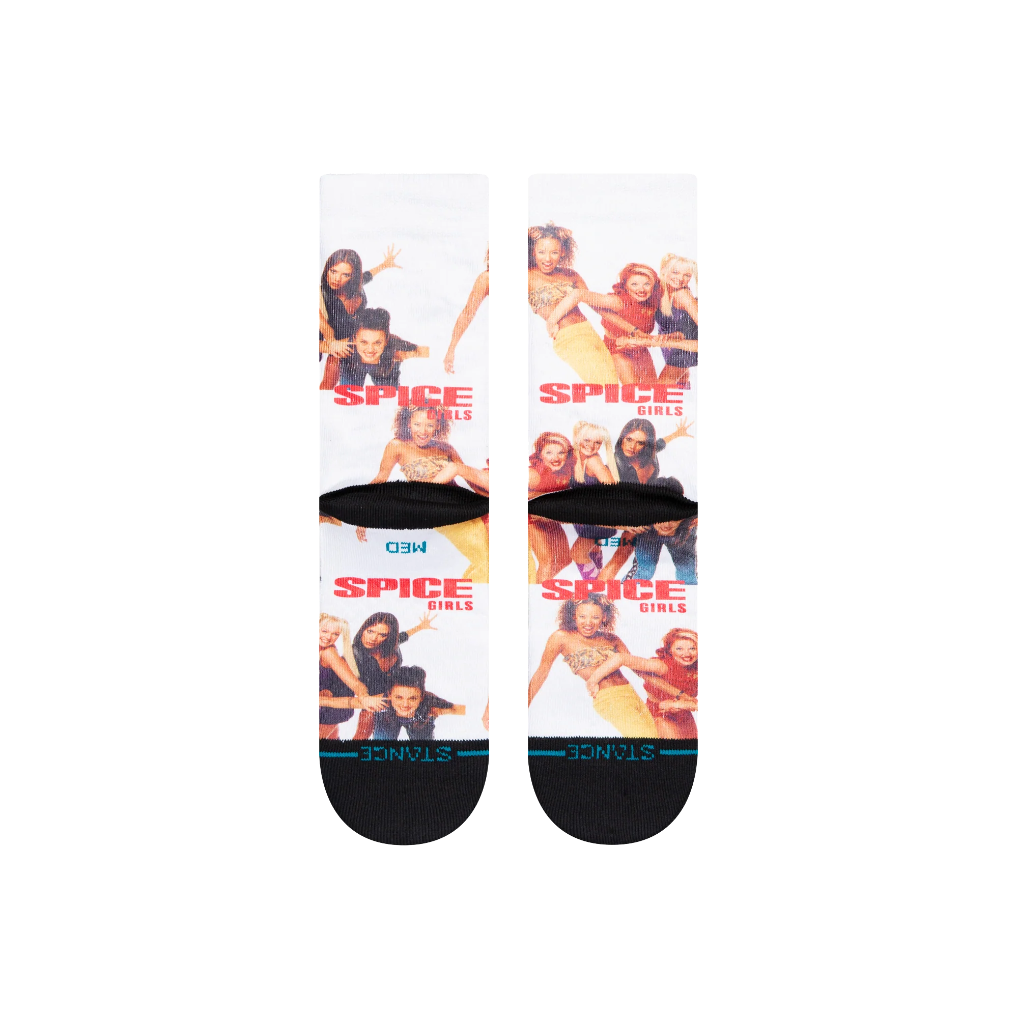 Luxury white crew socks featuring iconic band imagery and red ‘Spice Girls’ logo, as part of the Stance x Spice Girls collaboration collection.