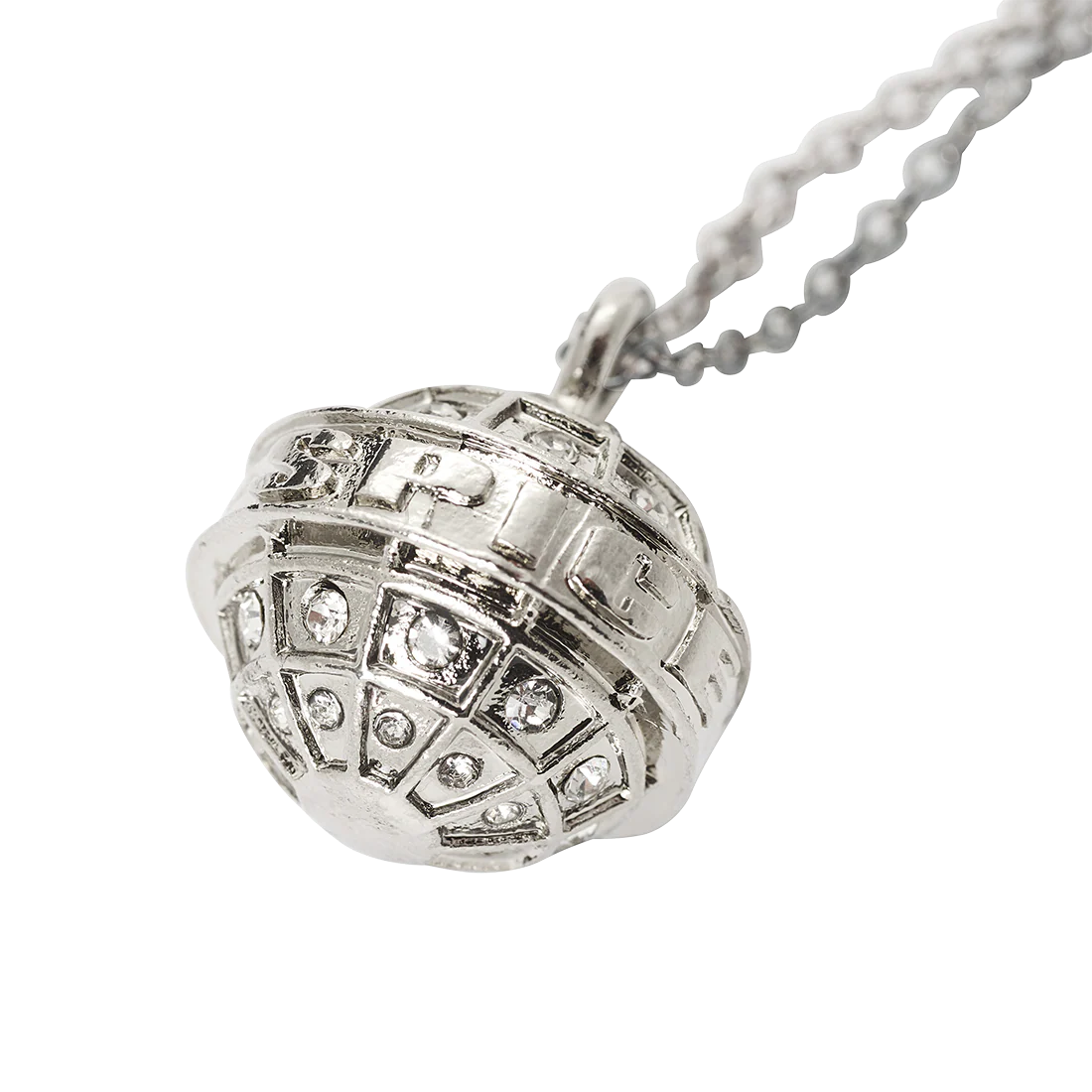 Silver necklace and globe pendant inlaid with single diamantes featuring 'Spice Girls' embossed around middle and black jewellery box with 'Spice Girls' printed inside.
