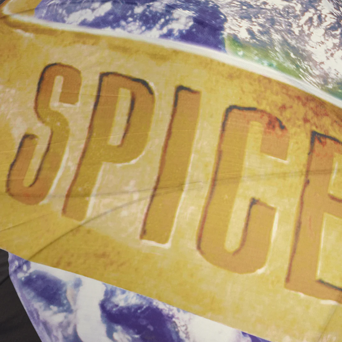 Large black umbrella featuring Spiceworld globe design on waterproof canopy and classic hooked handle.